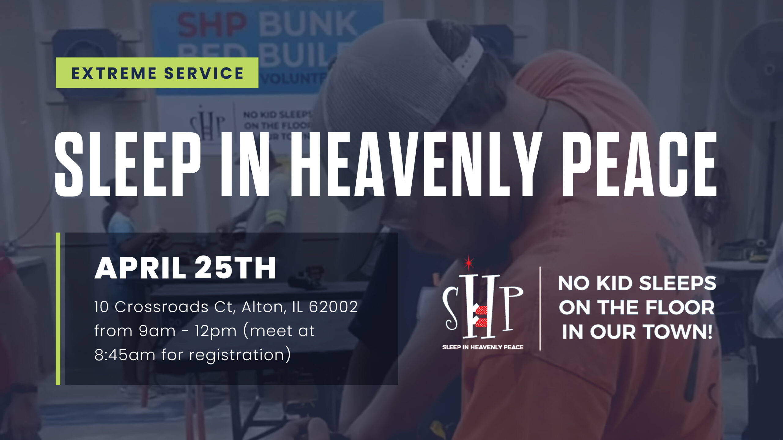 Please join us for a great cause! We will make beds for kids by sanding, drilling, cutting, staining, and branding wood! Dress in old clothes that you don’t mind getting dirty. Meet at the Sleep in Heavenly Peace location by 8:45AM to get registered. You may also bring new twin size bedding as a donation if you wish.