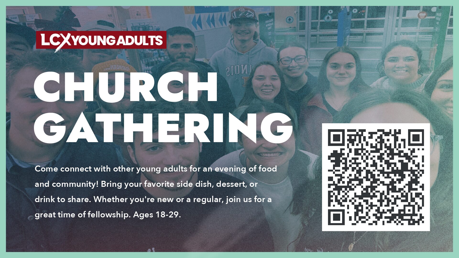Join us on May 15th at 6:30pm to connect with other young adults for an evening of food and community! Bring your favorite side dish, dessert, or drink to share. Whether you’re new or a regular, join us for a great time of fellowship! Ages 18 - 29.